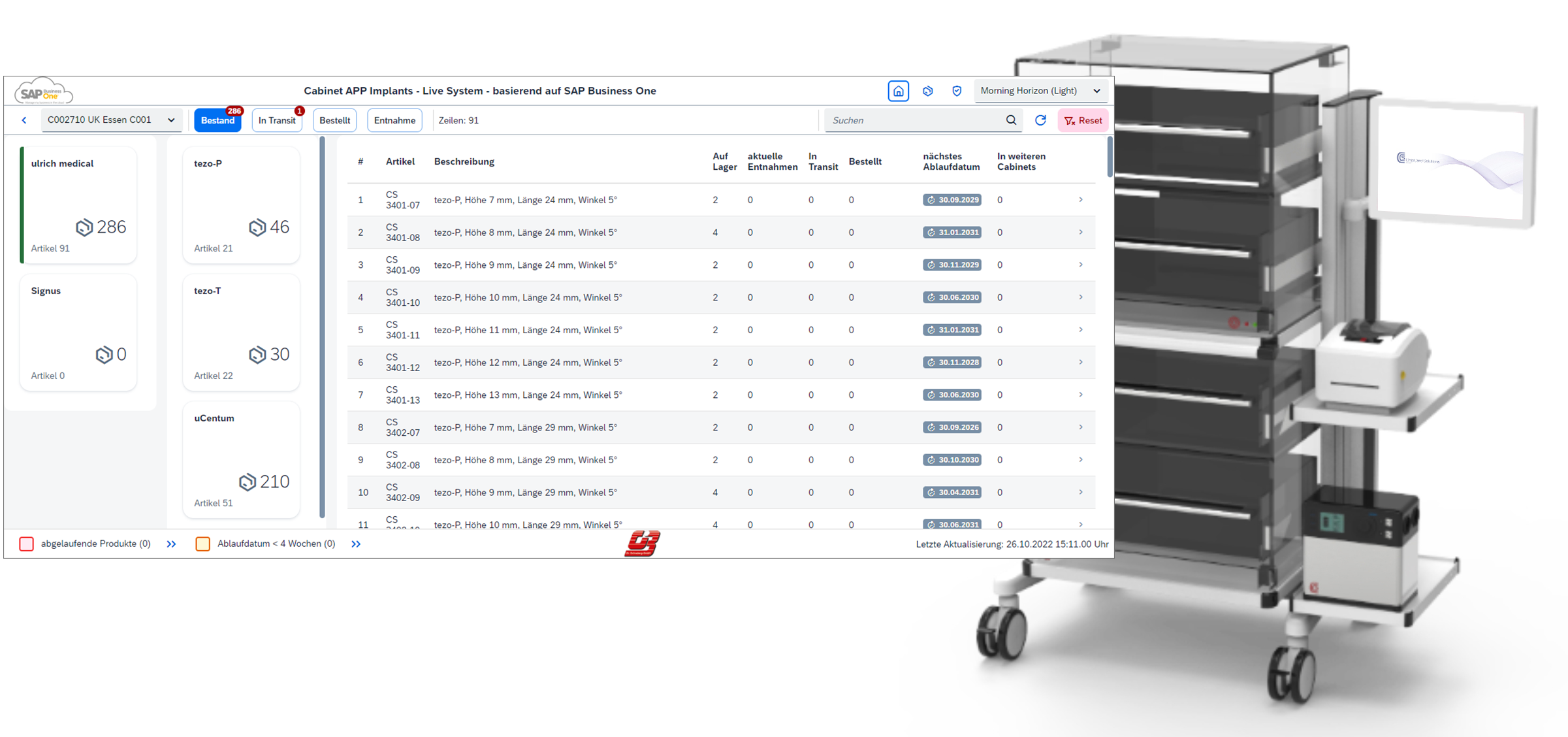 Dies betrifft u.a. die Nutzung mobiler Aufbewahrungsschränke direkt im OP-Bereich mit Anbindung an die entsprechende OP-Software. Dadurch wird eine Real-Time Übertragung der entnommenen Produkte (z.B. Implantate) auf den OP-Bildschirm und die entsprechende klinische Dokumentation möglich.